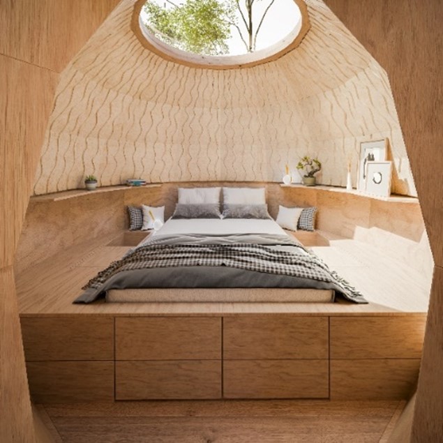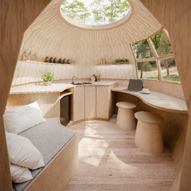 „Naším záměrem bylo za použití mykokompozitu a dalších přírodních materiálů využít vnitřní prostor co nejvíce prakticky, ale současně tak, aby budil pocit přírody spojené s luxusem a aby své návštěvníky na první pohled uchvátil. Kuchyňská část obsahuje lednici a vařič na plyn v kombinaci s dřezem, do nějž je zavedena voda z barelu umístěného ve skříňce pod kuchyňskou deskou. Vedle pracovní plochy, polic a otvíracích skříněk je zde prostor pro sezení a jídelní část. Ložnice má řadu vychytávek přes úložné prostory až po plochy určené speciálně pro mobily, tablety, hodinky apod.,“ říká Karolína Petřeková a Patra Jašicová doplňuje: „Zdroj elektřiny řešíme skrze solární systém umístěný na střeše v místě spoje bedel. Energii pro spotřebiče, osvětlení i dobíjení zařízení poskytne nabíjecí baterie. Přívod tepla pro chladnější období pak zajistí elektrické přímotopy. I pro vnitřní zařizovací prvky jsme co nejvíce využívaly mykokompozit. Má tak originální vlastnosti a nádherné struktury, že skvěle dotváří moderní design obytných prostor.“