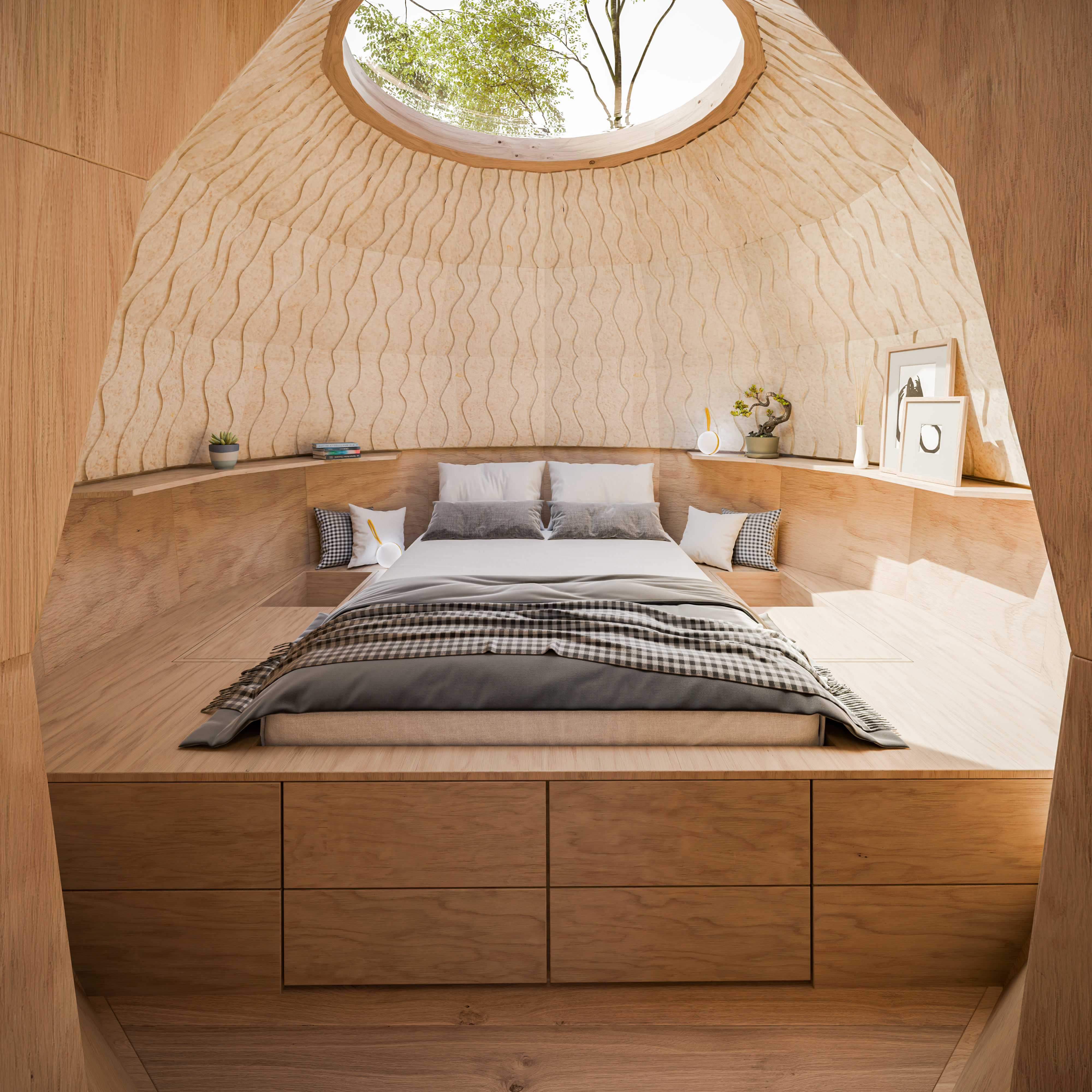 Koncept domu SAMOROST umožňuje nekonečné variace ve velikosti hub i v jejich vnitřní dispozici a funkci. V této fázi byla zvolena ukázka kombinace kuchyně se sezením v jedné bedle a ložnice ve druhé. Autorkami interiéru jsou Karolína Petřeková a Petra Jašicová ze Spolku MYMO.